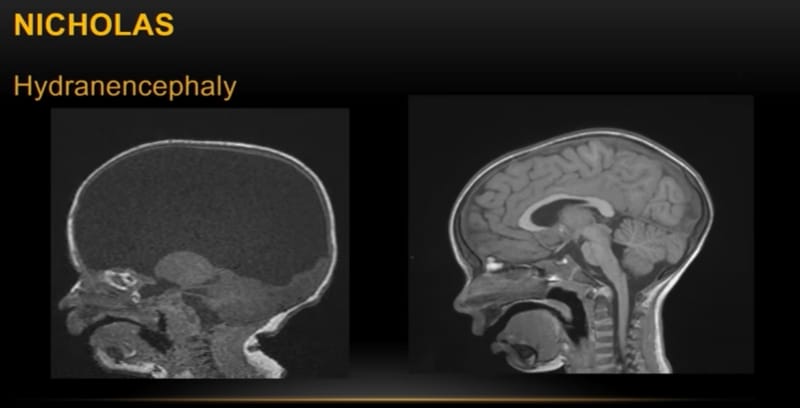 This is a little boy named Joshua. He was born missing also about two-thirds of his brain. Again, the black space in the image is just water. He was evaluated by the ethics committee at my hospital and they recommended that he not be fed when he was born because he was in such terrible shape that it'd be better if he passed away. We rescinded that order and fed him and he's now graduating from high school. Perfectly normal young man. He plays sports. He's a great kid.